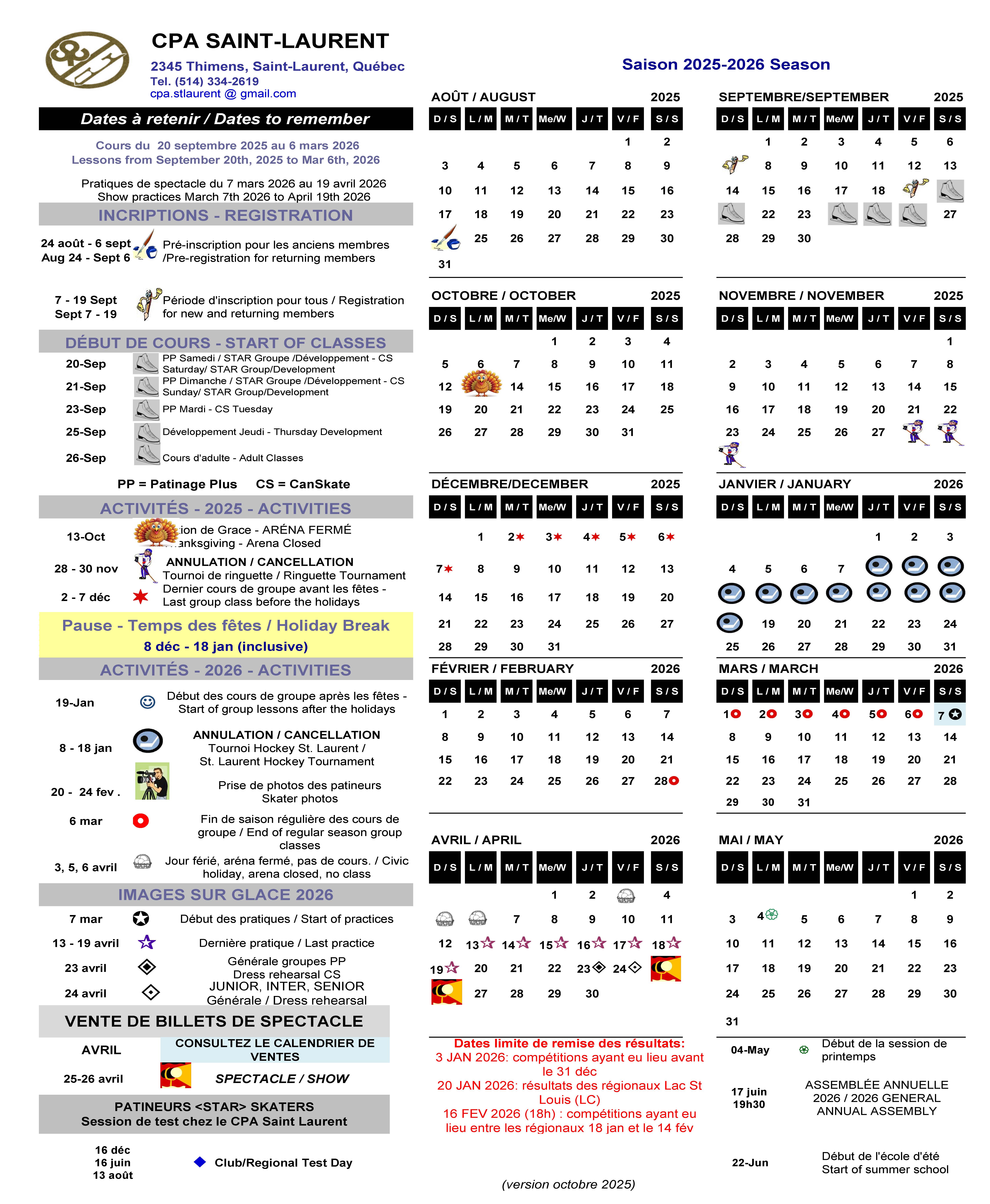 INSCRIPTIONSPour bénéficier des escomptes, le titulaire du compte est responsable de remettre au club par courriel (cpa.stlaurent@gmail.com) toute mise à jour des dossiers 48 heures AVANT l'inscription . Ces informations peuvent être et ne se limitent pas à:té: 30 juin 2019.Documents émis par l'arrondissement pour les familles à faible revenu. Les inscriptions effectuées sans avoir remis les documents obligatoires ne receveront aucun escompte. Conformément aux politiques de l'Arrondissment, aucun ajustement ne sera accordé si la documentation n'est pas remise à temps. La Carte Loisirs de l'arrondissement de Saint Laurent est obligatoire pour la création et la mise à jour de tout compte patineur. Le système de carte loisir de l'arrondissement de Saint Laurent n'est pas lié au système d'inscription du club. Les parents doivent soumettre une copie de toute mise à jour au club au moins 48 heures avant l'inscription. |